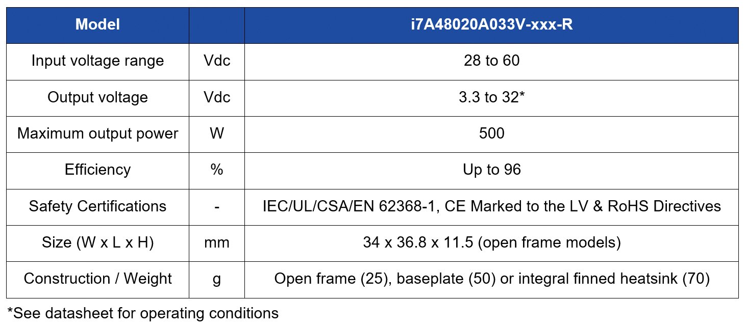 The i7A standard features include output voltage adjustment, positive remote sense, negative logic remote on-off, input under-voltage, over-current and over-temperature protection. Evaluation boards are available for simplified qualification.