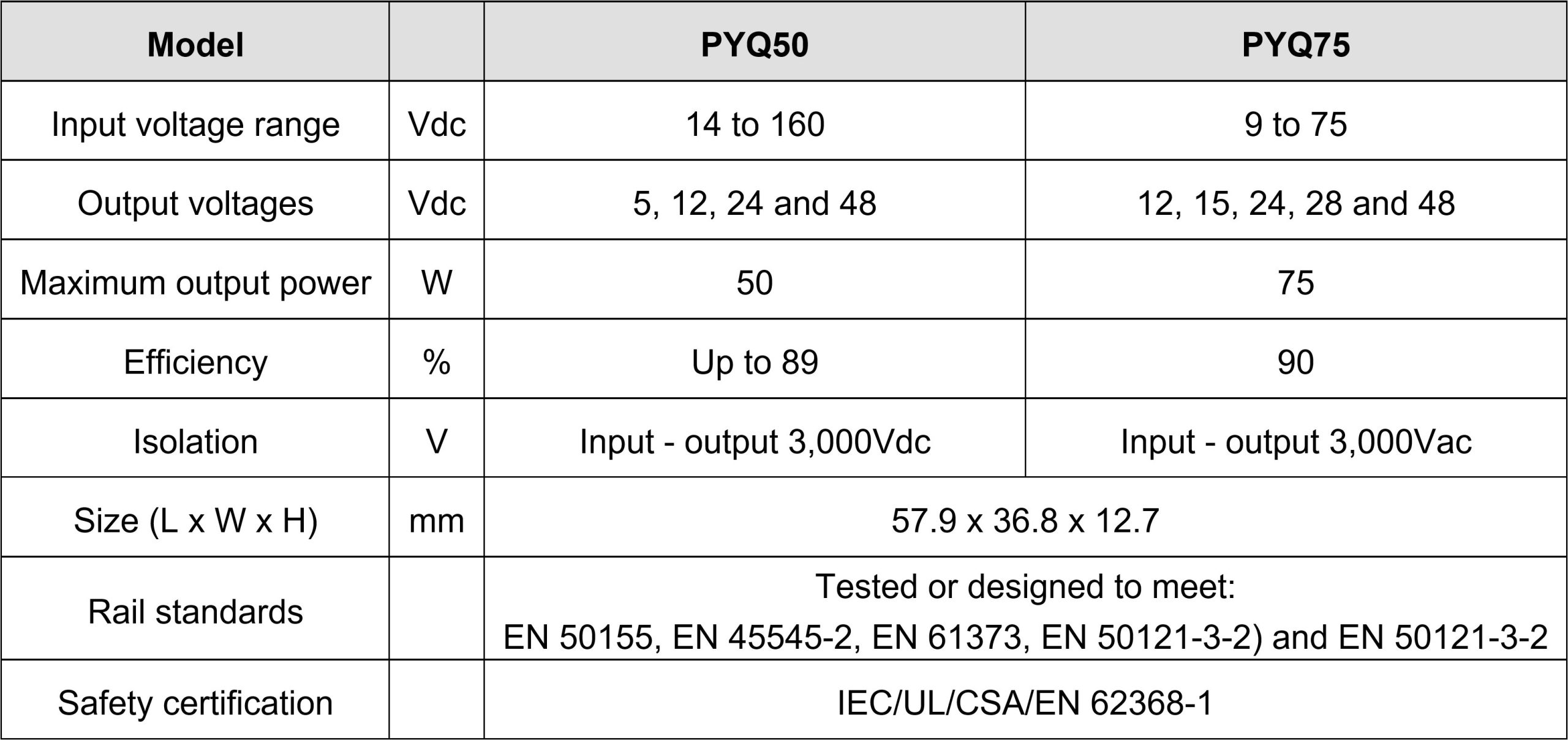 The PYQ50 converters are available with 5V, 12V, 24V and 48V outputs and the PYQ75 with 12V, 15V, 24V, 28V and 48V. Using the trim function, they can be adjusted using a resistor or an external voltage to compensate for voltage drops, or to accommodate non-standard system voltages. The PYQ models have overvoltage, overcurrent and overtemperature protection.