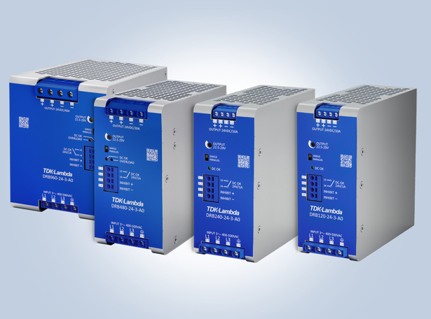 TDK Corporation (TSE 6762) announces the addition of higher power, three-phase AC input models to the TDK-Lambda DRB series of economically priced DIN rail mount power supplies. With 24V, 48V and 72V outputs, the products are rated for continuous operation at 480W or 960W and can deliver a boost of 720W and 1440W respectively for up to seven seconds. This, and a constant current overload characteristic, enables operation with capacitive and inductive loads. These power supplies also feature a very low energy inrush current upon initial start-up, reducing nuisance tripping of input circuit breakers. The DRB three-phase series can be used in a wide range of applications, including conventional switch cabinets, stand-alone machinery and industrial systems, as well as information and communications technology.