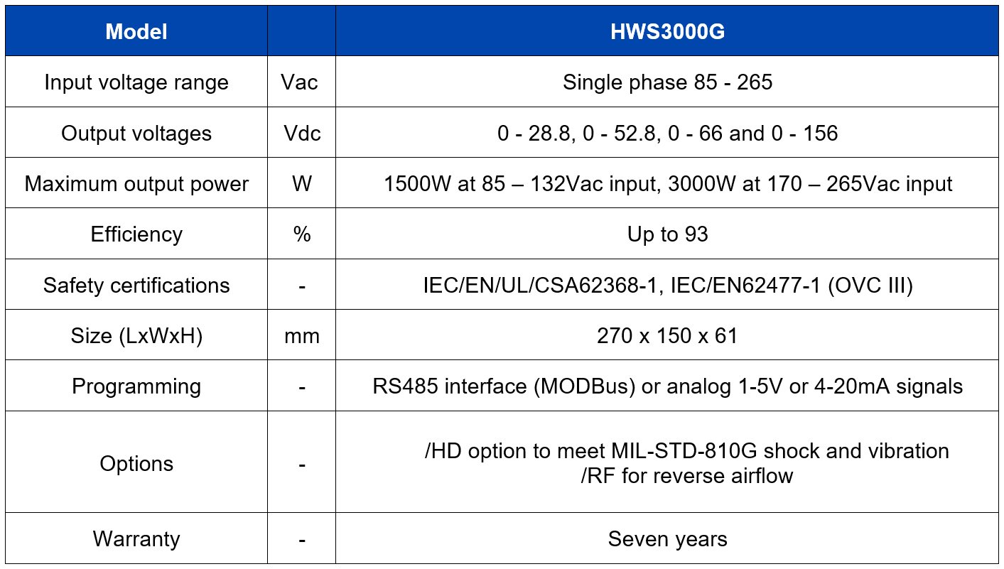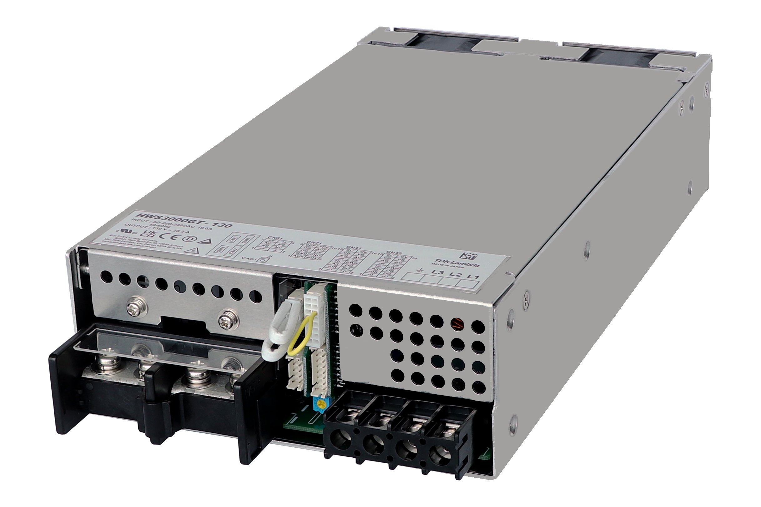 TDK Corporation (TSE 6762) announces the introduction of the 3000 watt TDK-Lambda brand HWS3000G programmable AC-DC power supplies. The nominal output voltages and output currents are fully programmable (CV/CC) from zero up to their maximum rating. These new models have an /HD option for board coating and the ability to meet MIL-STD-810G Shock and Vibration in harsh environments. The /RF option provides the ability to have the airflow direction reversed for compatibility with the user’s end system.