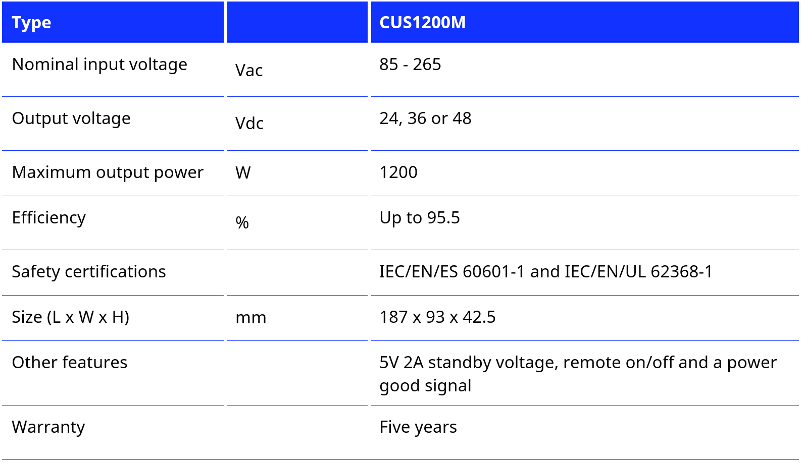 The series accepts an 85 to 265 Vac input, delivering full power at 90 Vac, and is available with 24 V, 36 V, and 48 V outputs. A 5 V 2 A standby voltage, remote on/off, remote sense and a power good signal are fitted as standard. With efficiencies of up to 95.5 %, internal heating is reduced, allowing reliable operation in the compact size. The off-load power consumption is typically <0.6 W when the supply is put into standby mode. The CUS1200M models can operate in ambient temperatures between -20 °C and +70 °C, derating linearly at high temperatures. The CUS1200M series has a five-year warranty.